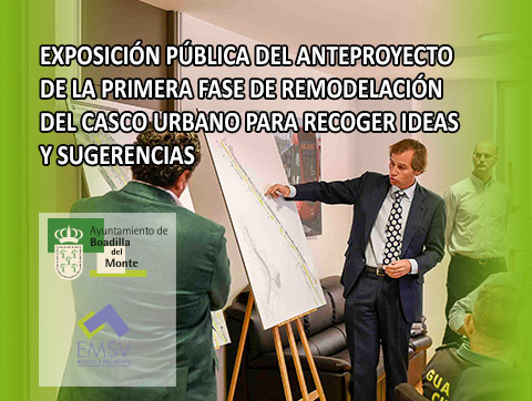 Hasta el 28 de octubre estará en exposición pública en la sede institucional del Ayuntamiento (Plaza de la Villa) el anteproyecto de la primera fase de remodelación del casco urbano, fruto del concurso que se convocó al efecto el pasado año, para que se puedan aportar ideas y sugerencias. Dicho anteproyecto prevé actuaciones en la carretera de Majadahonda, el Parque del Caño y el área comprendida entre el aparcamiento del Paseo de Madrid y la zona del Nacedero.