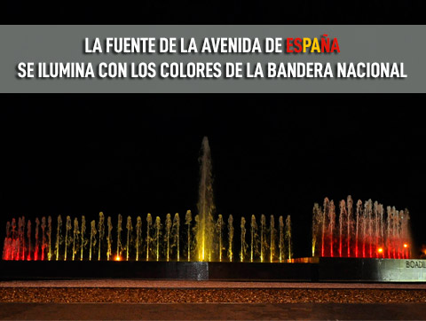 Los colores de la bandera nacional lucen desde anoche en la fuente que está ubicada en la rotonda de la avenida de España, en una de las entradas al municipio. La rotonda fue remodelada hace unos meses ante la necesidad de soterrar la línea aérea de media tensión, cuya traza discurría en parte por encima del vaso de la fuente interfiriendo con el funcionamiento de la misma. Además del arreglo de la fuente, se actuó en el ajardinamiento y se instaló una red de riego.
